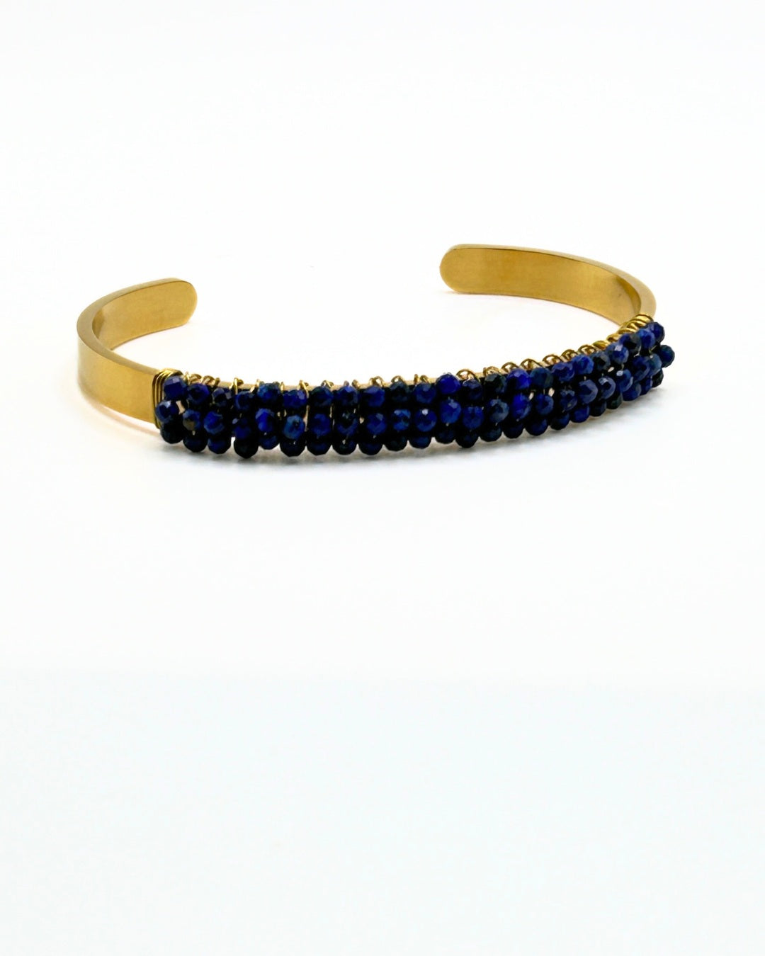 Crafted from 18K gold plated stainless steel, this piece is hand wrapped with faceted lapis lazuli for unmatched sparkle. Indulge yourself and add a touch of sophistication to your cuff collection.